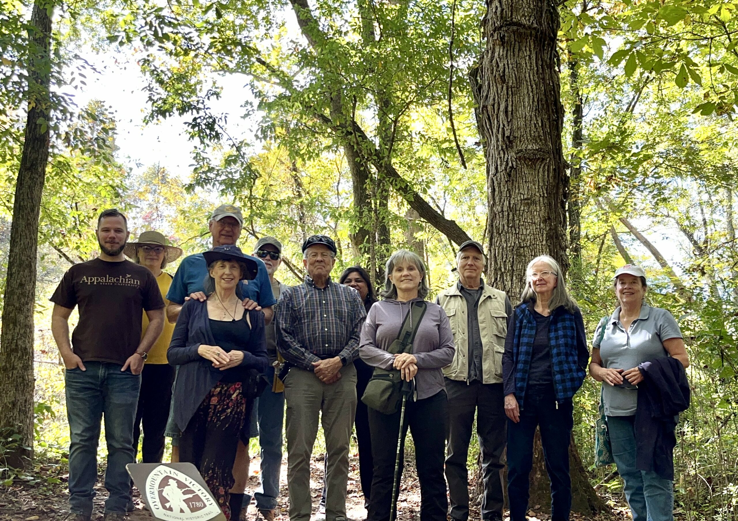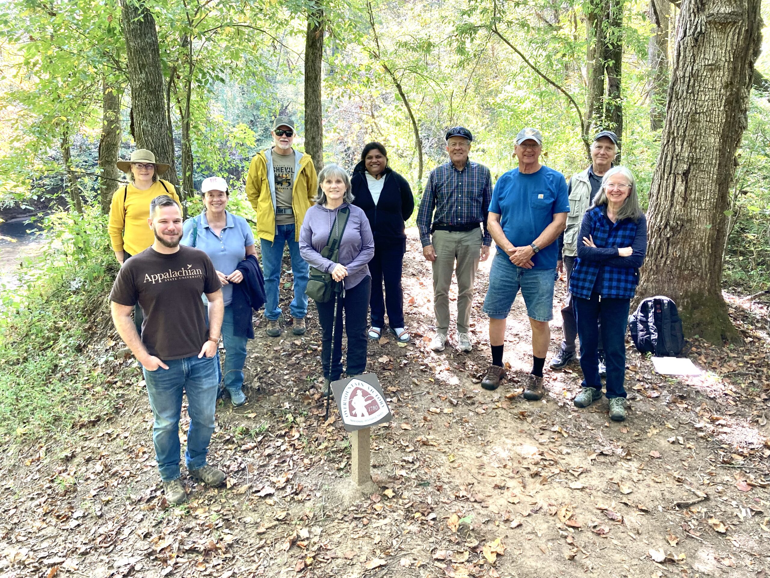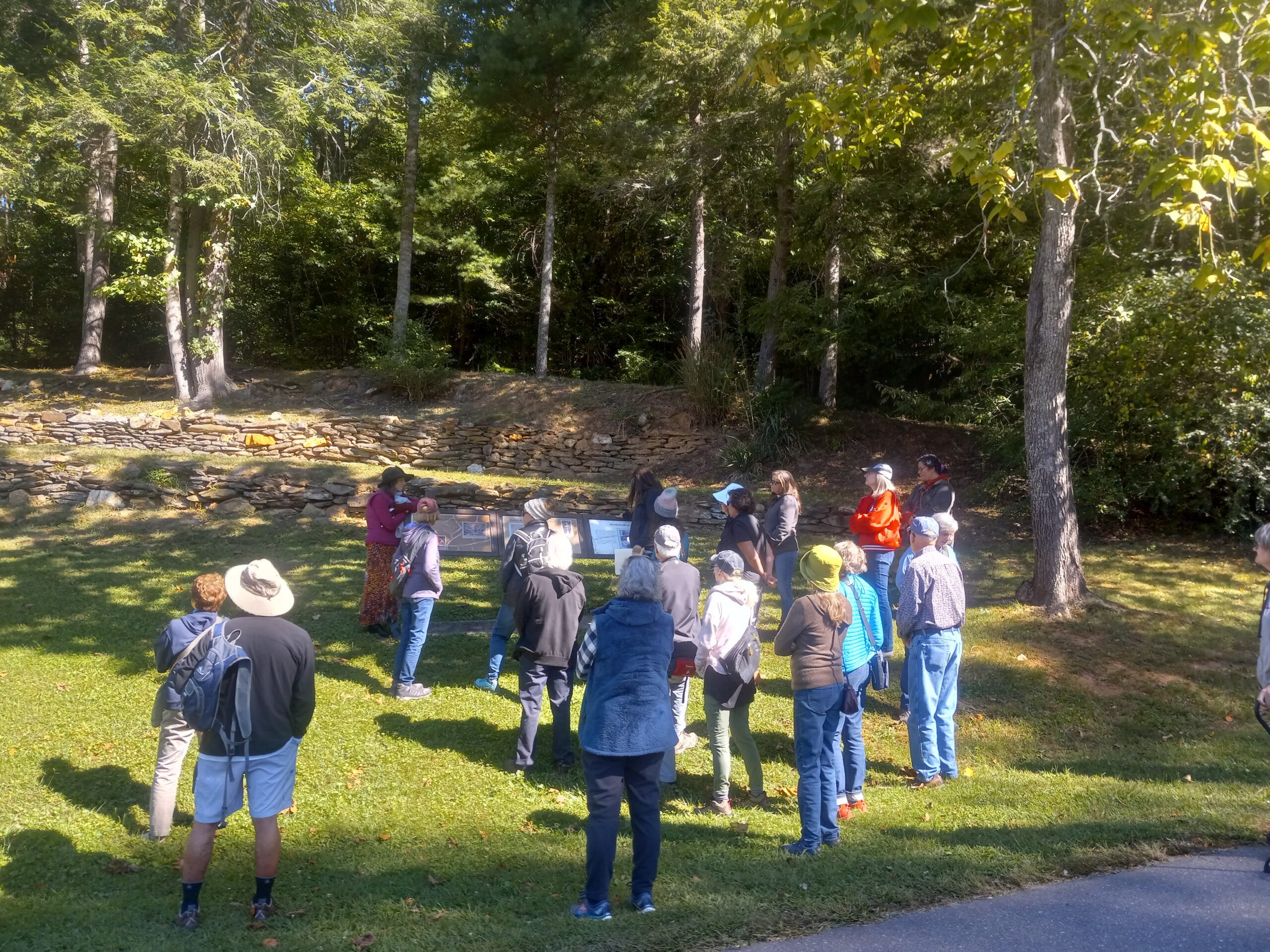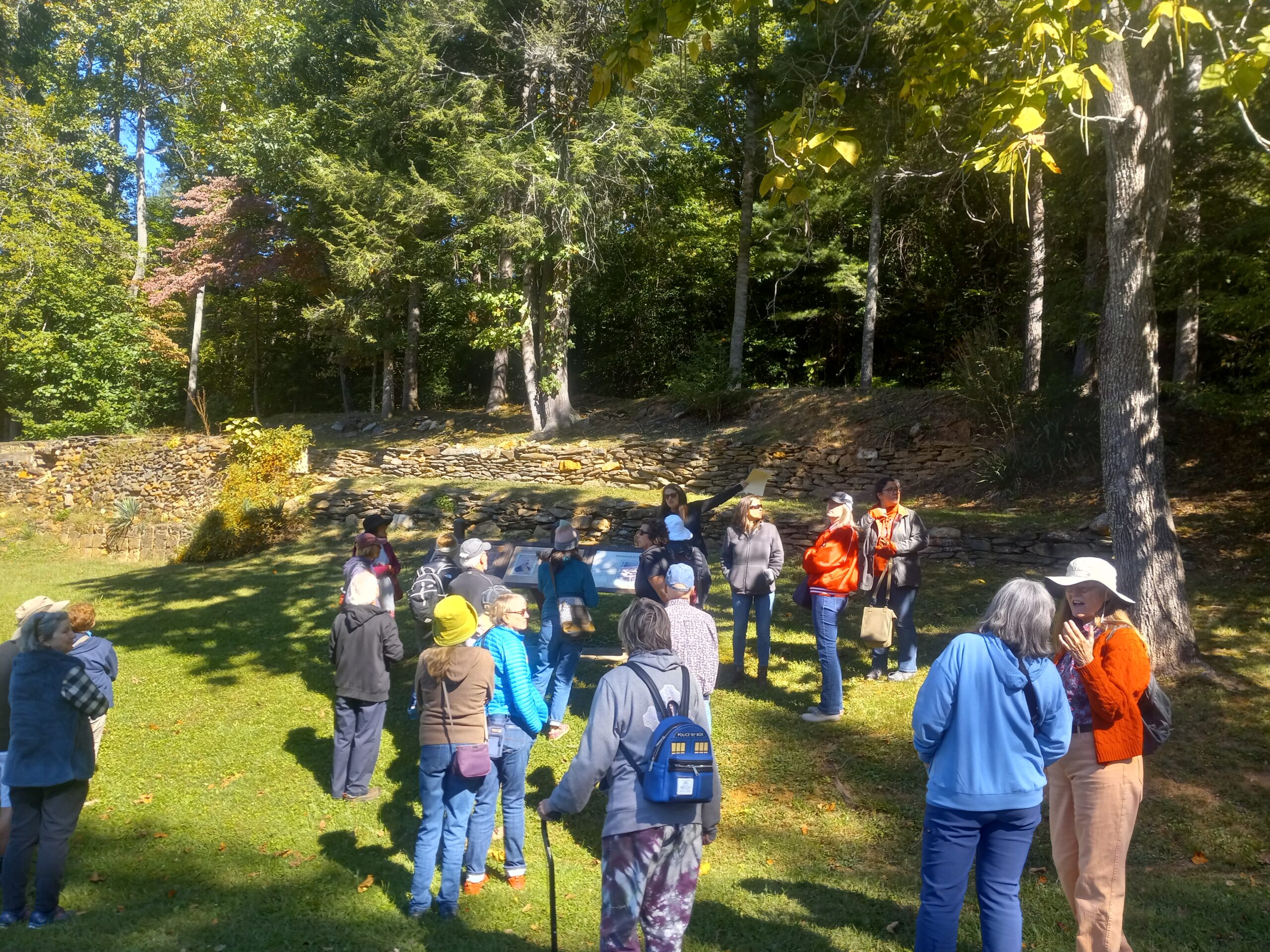 It was a beautiful fall day to hike a section of the Overmountain Victory National Historic Trail to Alexander’s Ford near the Rutherford/Polk County border. Led by our public programs director, guests learned about the 1780 Battle of Kings Mountain in the bigger context of divided loyalties in the WNC foothills and mountains during the American Revolutionary War. We paid particular attention to the stories of Loyalists (or those accused thereof) and their plight during and after the conflict. On the way out, we learned more about an adjacent cemetery, likely where unidentified enslaved people were buried, and Gray’s Chapel, named after a participant at Kings Mountain.