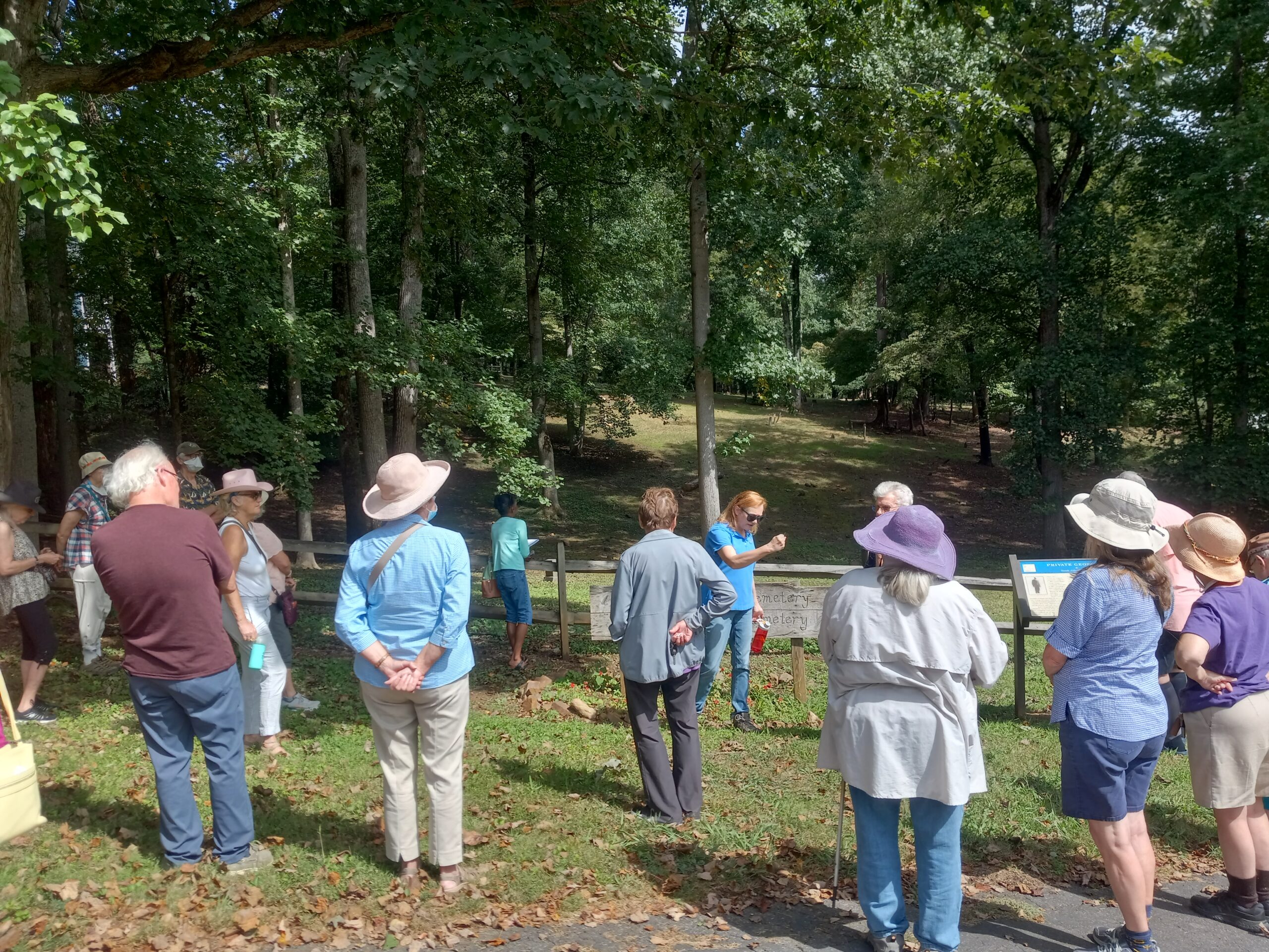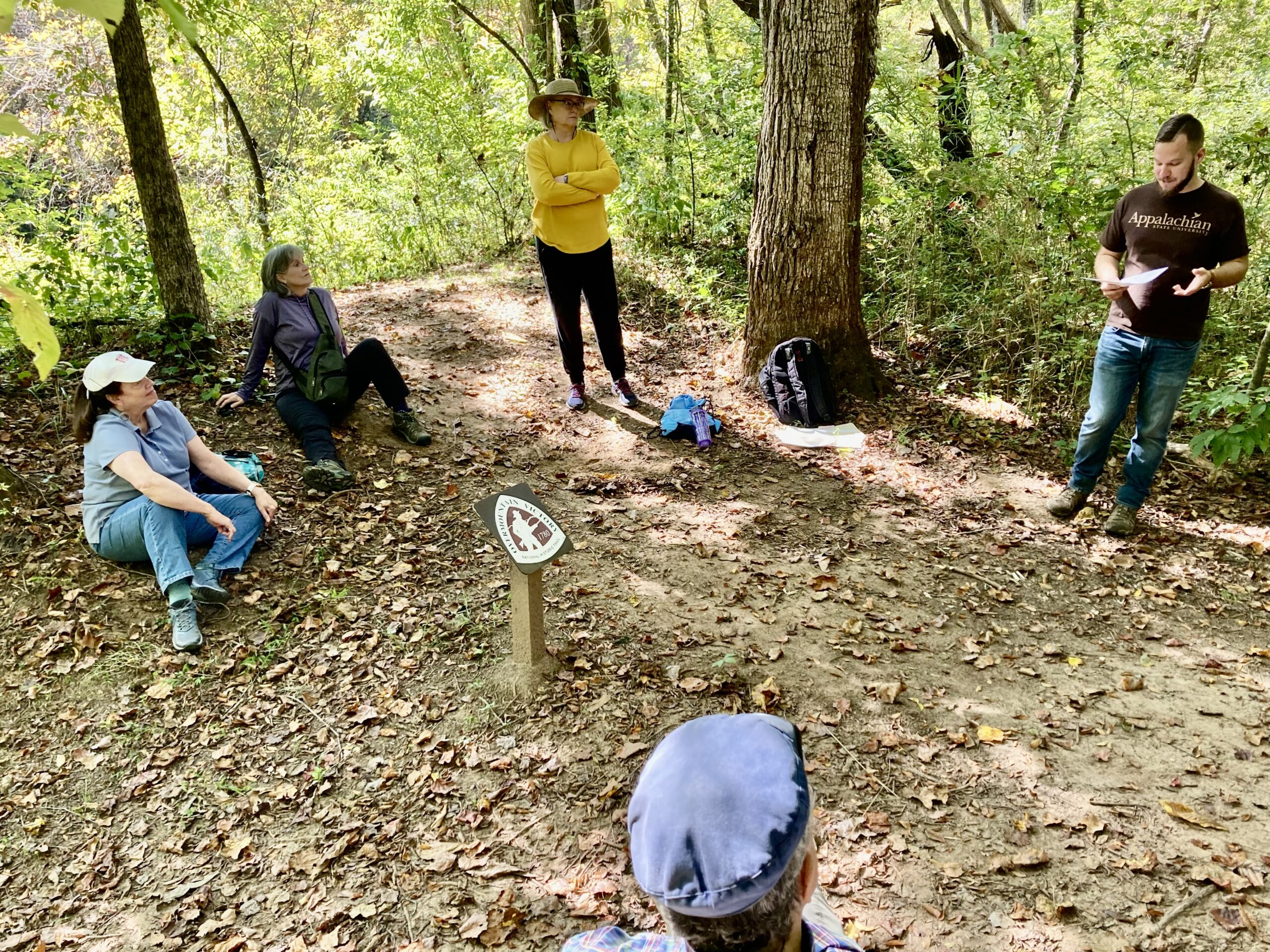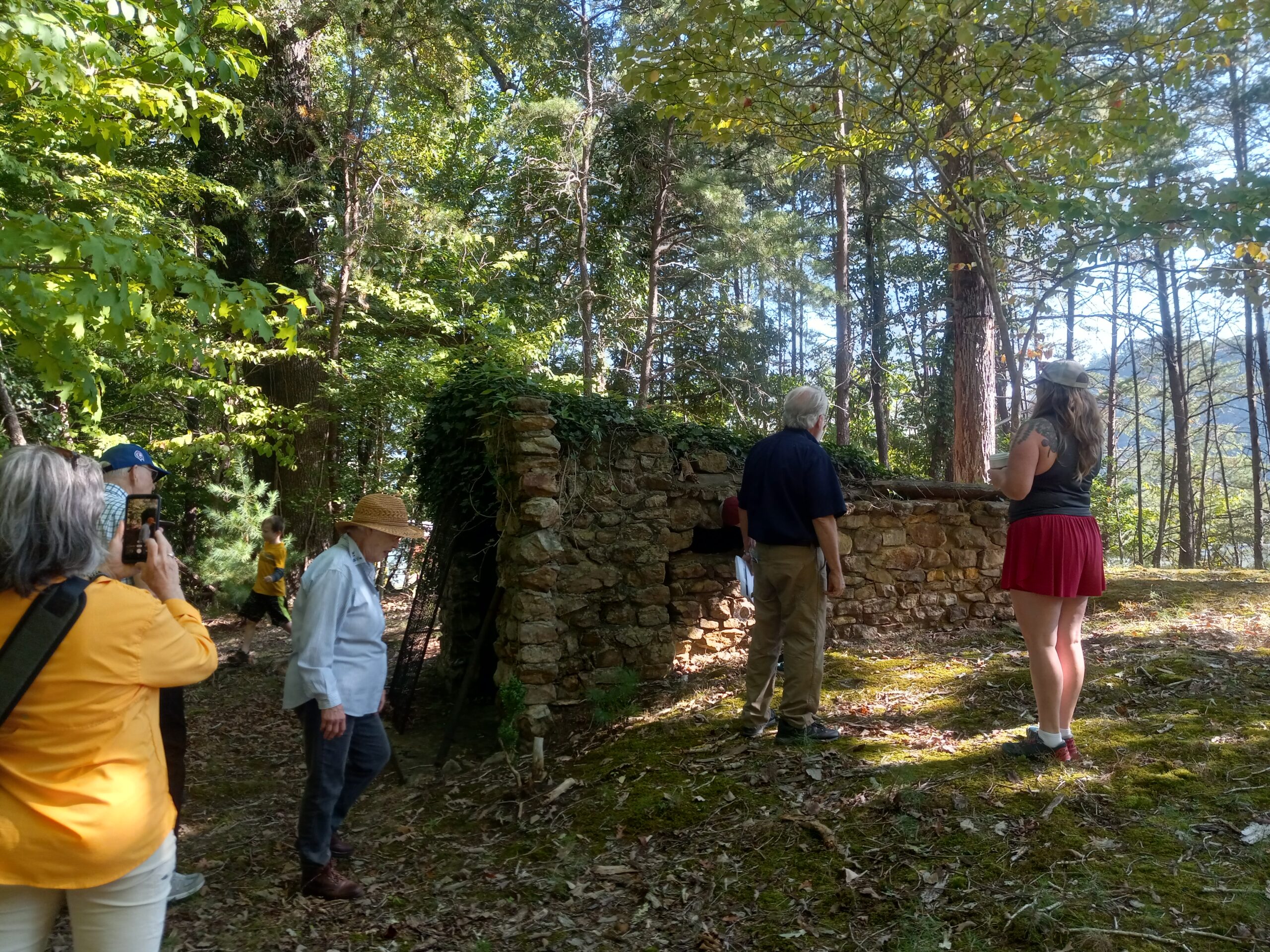 It was a beautiful fall day to hike a section of the Overmountain Victory National Historic Trail to Alexander’s Ford near the Rutherford/Polk County border. Led by our public programs director, guests learned about the 1780 Battle of Kings Mountain in the bigger context of divided loyalties in the WNC foothills and mountains during the American Revolutionary War. We paid particular attention to the stories of Loyalists (or those accused thereof) and their plight during and after the conflict. On the way out, we learned more about an adjacent cemetery, likely where unidentified enslaved people were buried, and Gray’s Chapel, named after a participant at Kings Mountain.