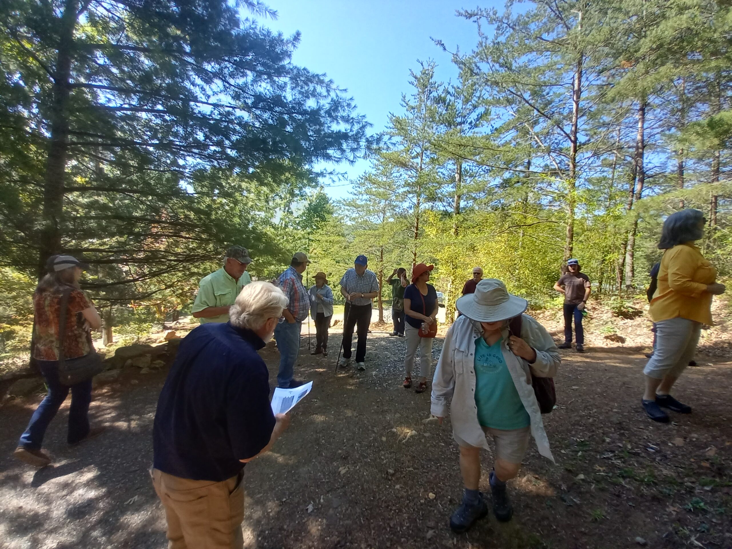 On this early fall day, we were grateful to have Dr. William Miller (UNCA emeritus professor of environmental studies) lead us on a short hike to the former Ray mica mine near Burnsville. Many of the deep pits and tailings from the mica extraction are visible, as are countless specimens of the transparent mineral scattered all throughout the area. We learned about the ancient geologic forces which shaped this section of the Appalachians millions of years ago and the social history of mining in the area in much more recent times. We hope you’ll join us for more hikes and outings in our Hikes With a Historian series in 2024!