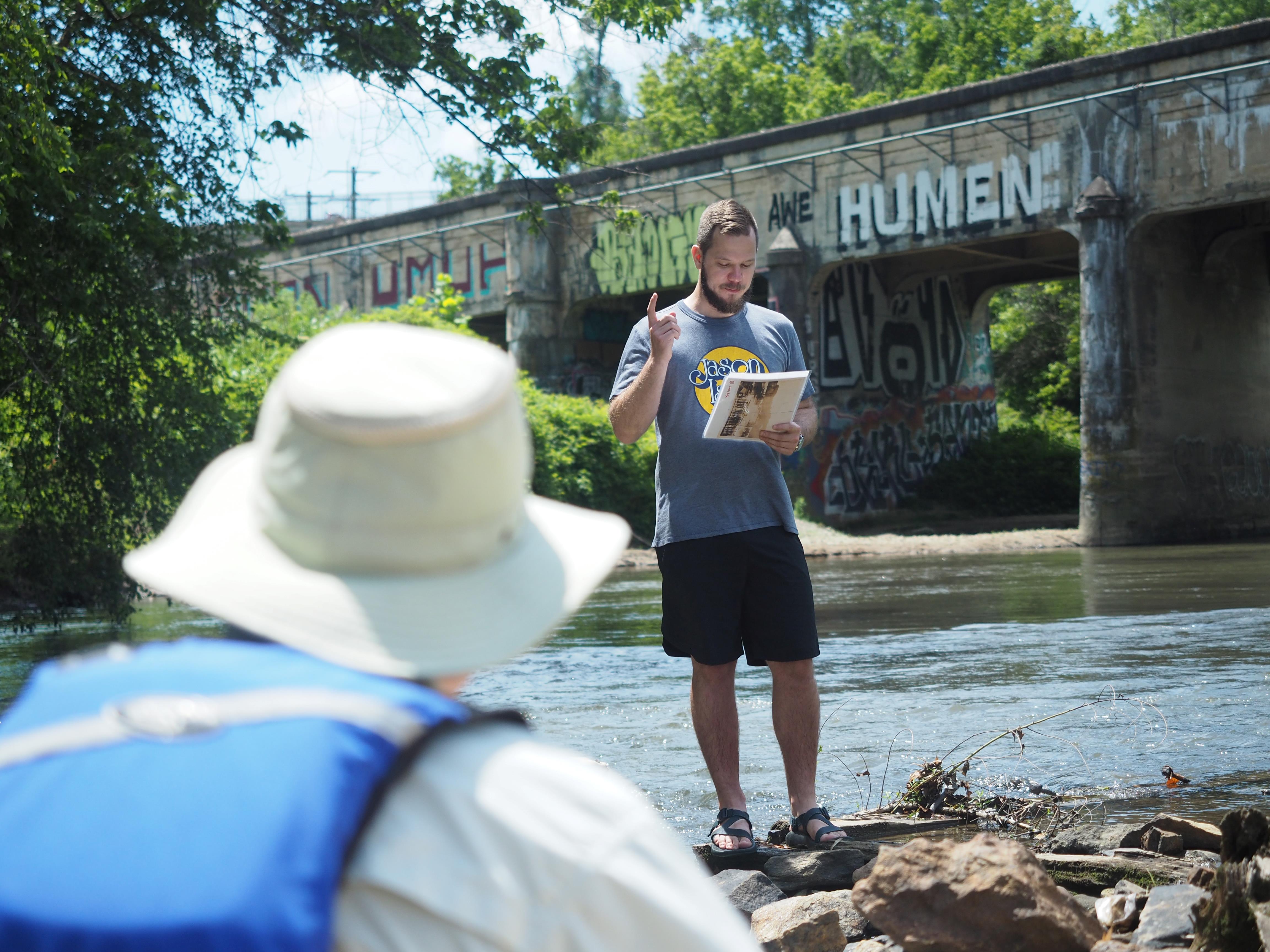 At the last recreational event in Conserving Carolina’s 5-part French Broad River Series, we partnered with them and MountainTrue to take guests on an interpretive paddle through one of the busiest and most historic sections of the river. Led by the AMoH public programs director, guests explored the environmental history of the larger French Broad watershed through the specific lens of this 6 mile section – the crossroads of the river. We also enjoyed wildlife along the way including herons, cormorants, and otters!
